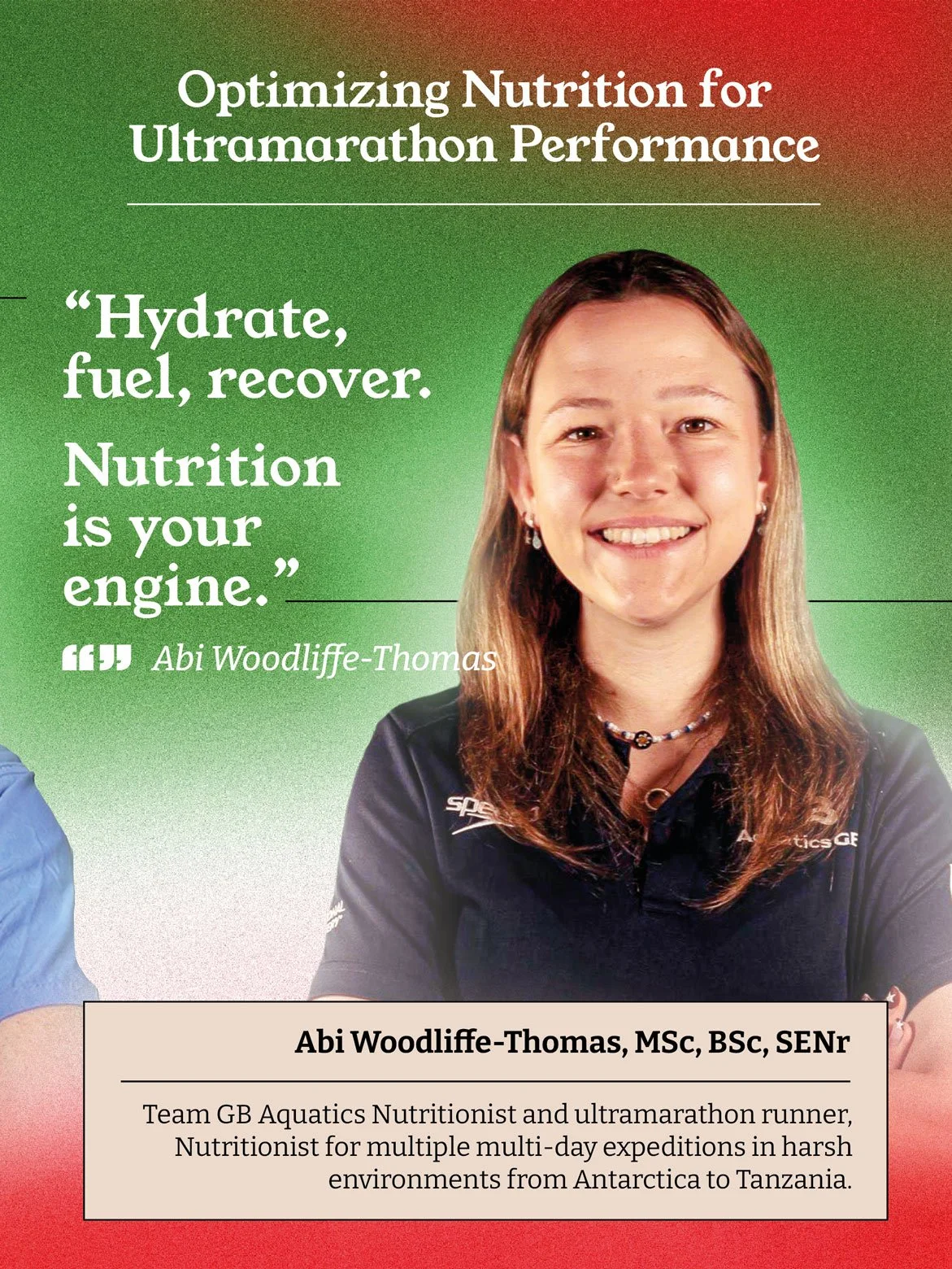 As the Team GB Aquatics Nutritionist, hostile-environment nutritionist and ultramarathon runner.