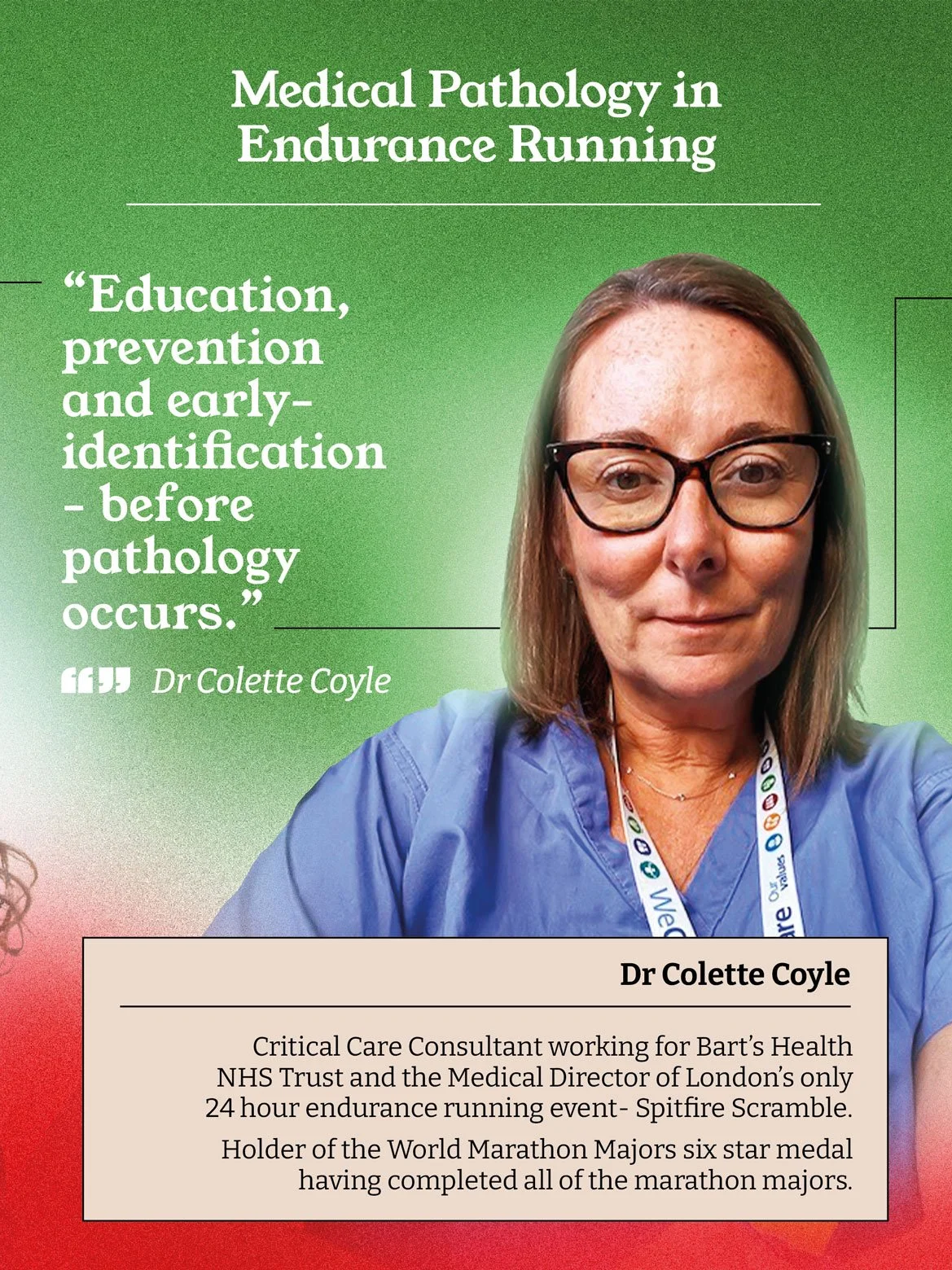 Dr Colette Coyle will discuss the most commonly encountered medical pathologies experienced in endurance running; from her perspective as a Critical Care consultant and ultramarathon Medical Director.