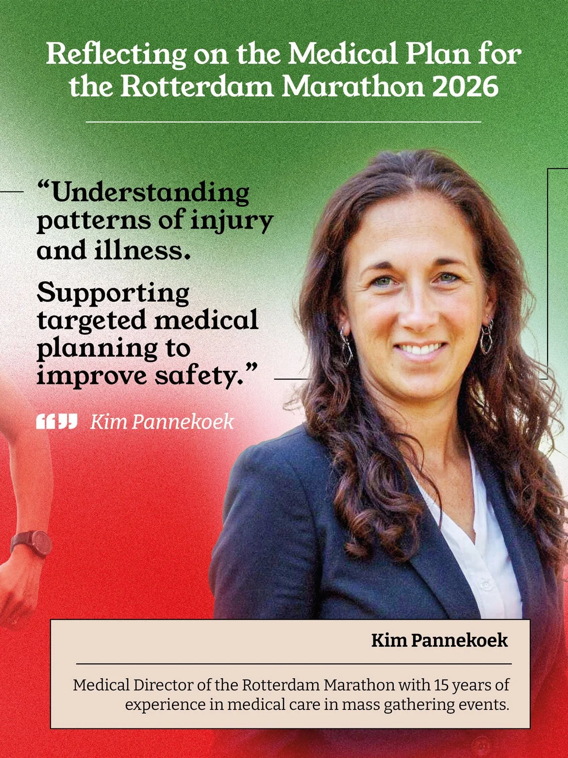 Kim Pannekoek linking real-world clinical presentations to operational decision-making; reflecting on the Medical Plan as the Medical Director of the Rotterdam Marathon.